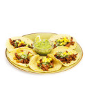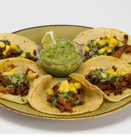 Servido con guacamole, piña, cebolla, cilantro y limón